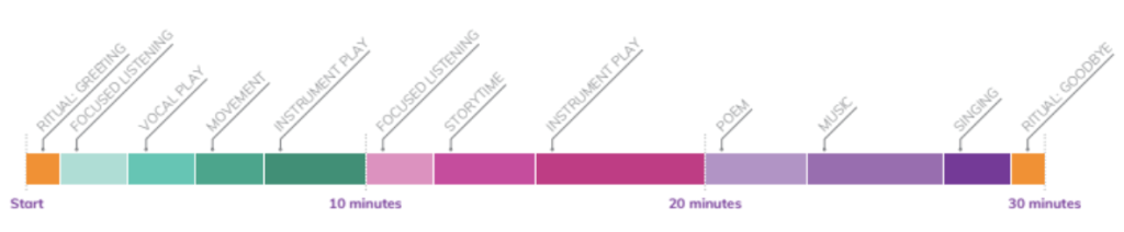 Our lesson plans are intentional, developed using a tested and repeatable formula. The individual activities within each lesson, such as greetings, storytime, and instrument play, are strategically placed for maximum engagement. The establishment of repetition and rituals allows children to take comfort in knowing what’s coming, encouraging creative participation within the established framework.